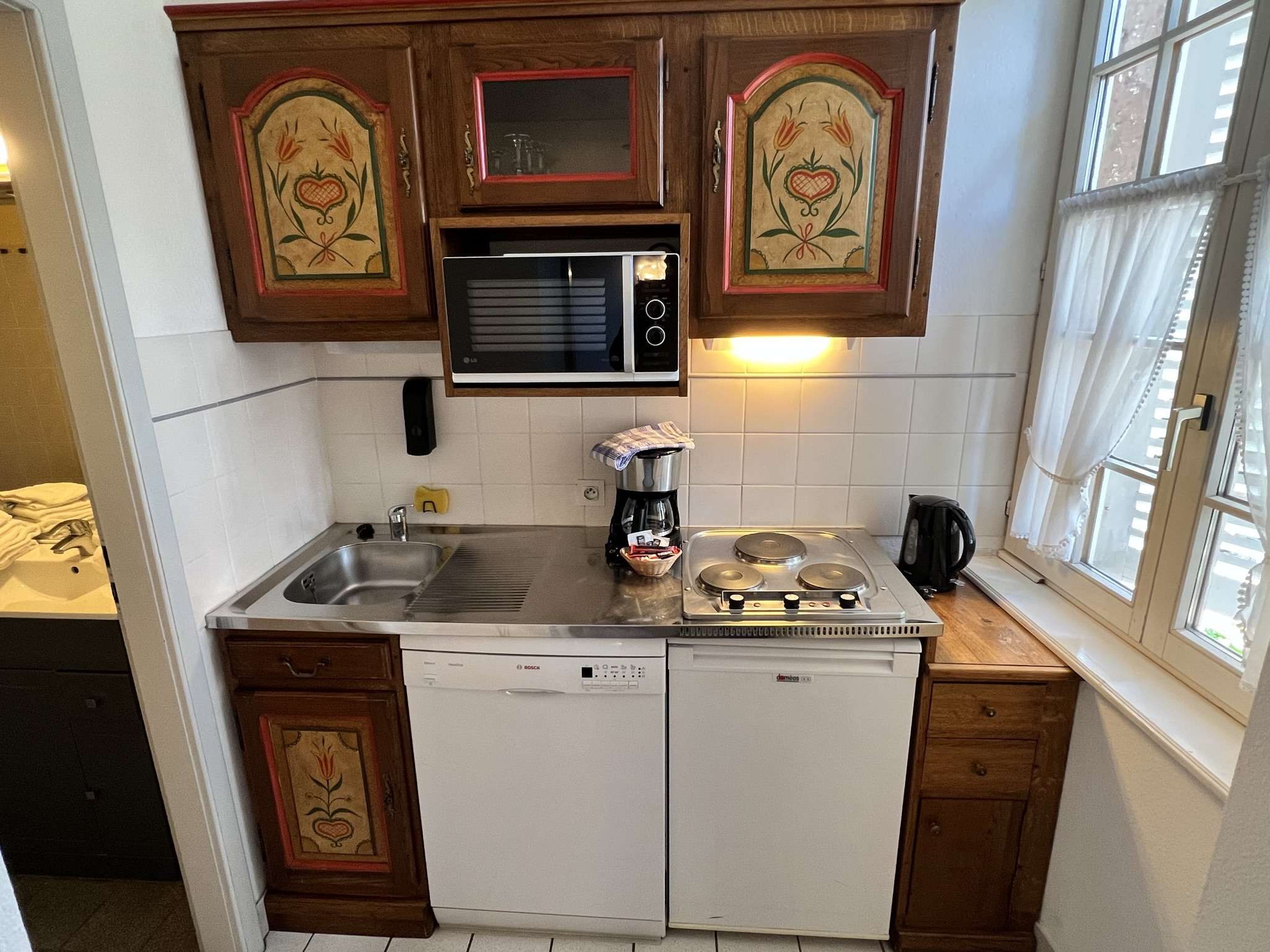 Studio « Charme », comprenant dans la même pièce un lit double queen size et un canapé-lit pour deux autres personnes, cuisine équipée, TV, salle de bain avec baignoire ou douche, WC.
