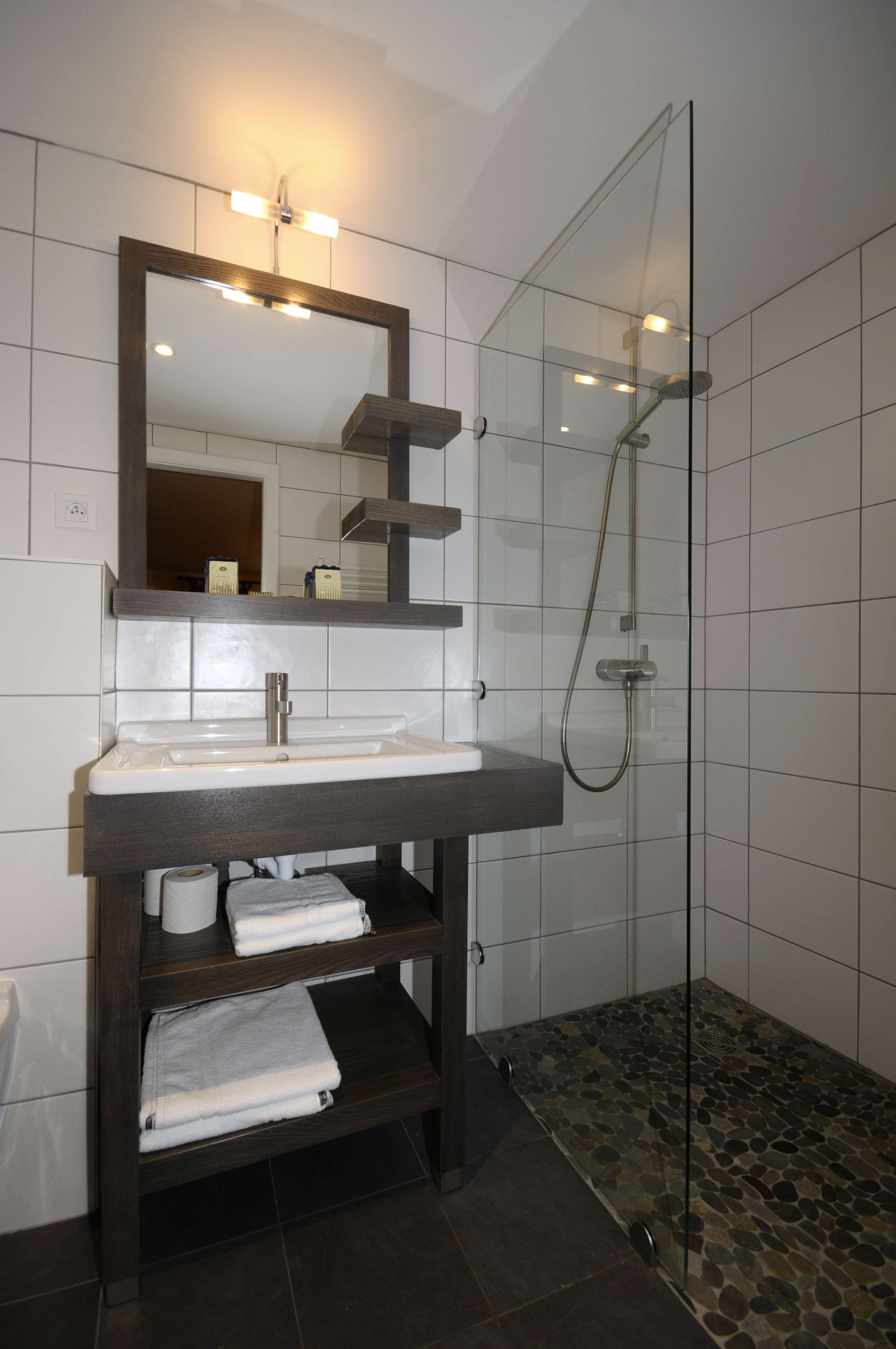 Suite « Junior » , comprenant un lit double queen size pour deux personnes, un coin salon, TV, salle de bain avec douche et WC.